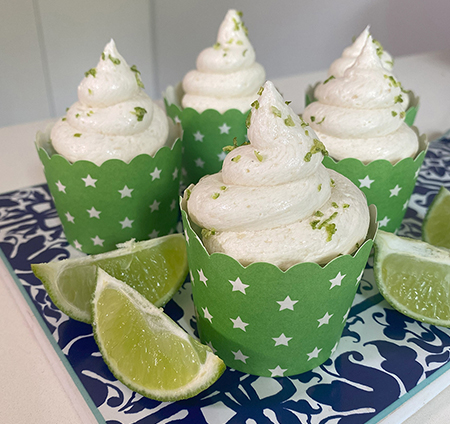 Friends recently gave us some fresh limes from their tree, and I wanted to give them a thank you gift, so I decided to make Lime Cupcakes. I have never considered making lime cupcakes before, but I am so happy that I did as they have such a fresh and delicious flavour. The cake has a lime flavour but it is subtle, so I wanted to add a burst of lime, so I added lime curd. To make sure that the cupcakes didn’t leave people with that ‘just sucked on a lemon’ face, I created 3 skinny channels in each cupcake so that burst of citrus isn’t overwhelming….